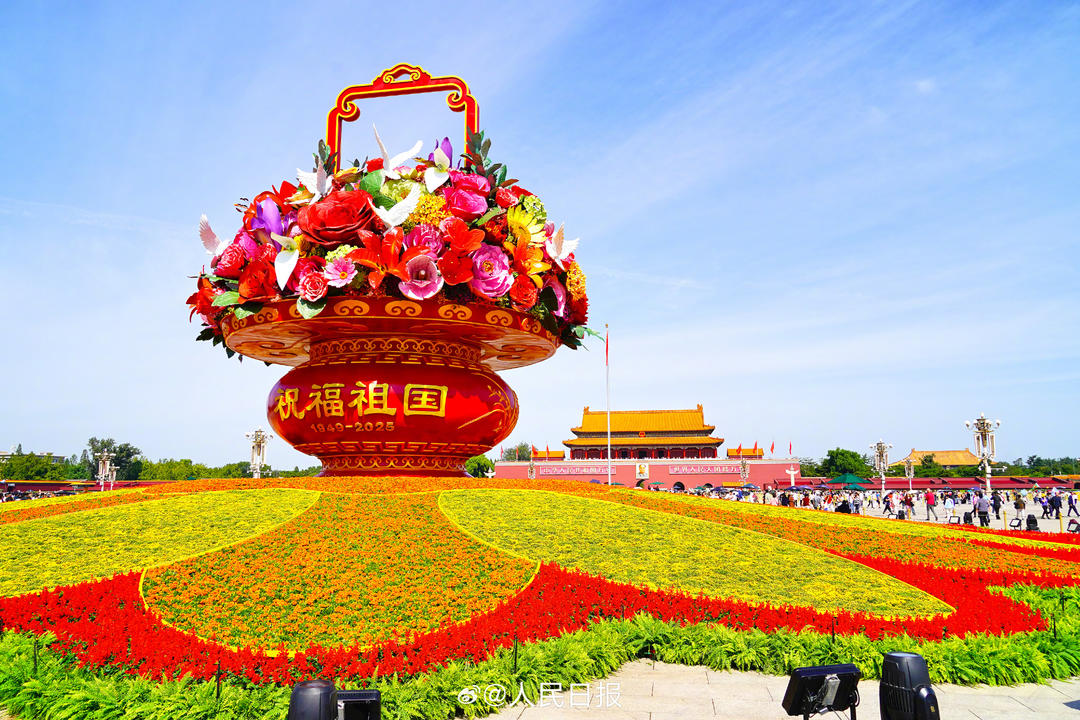 9月25日,2025年“祝福祖国”巨型花篮正式完工并亮相北京天安门广场。天安门广场中心“祝福祖国”花坛以喜庆的花篮为主景,花坛底部直径45米,为向日葵图案。花坛顶高18米,篮体高16米,篮盘直径12米。篮内选取了寓意美好的花卉,结合和平鸽元素,体现“和平发展、欣欣向荣”。详情>>