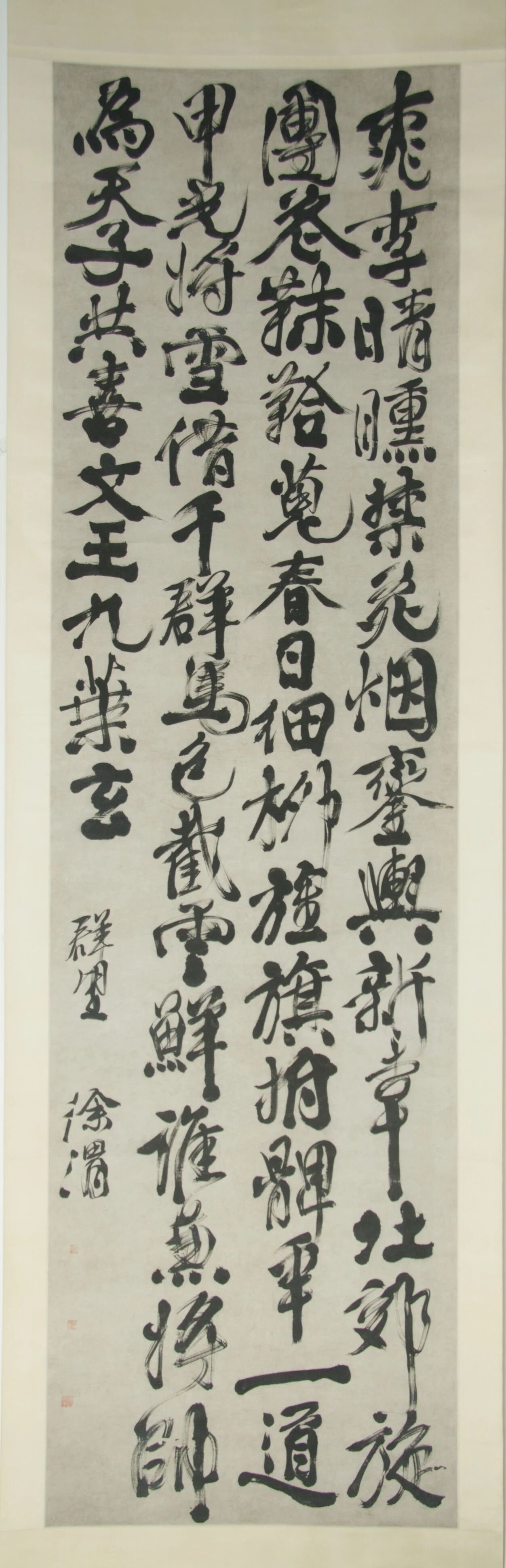 展出的明徐渭纸本行书群望诗中堂,是徐渭的代表作。徐渭,字文长,号天池山人、青藤道士等,山阴(今浙江绍兴)人。其书法在明代书坛独树一帜,并对王铎、傅山等书法家产生影响。