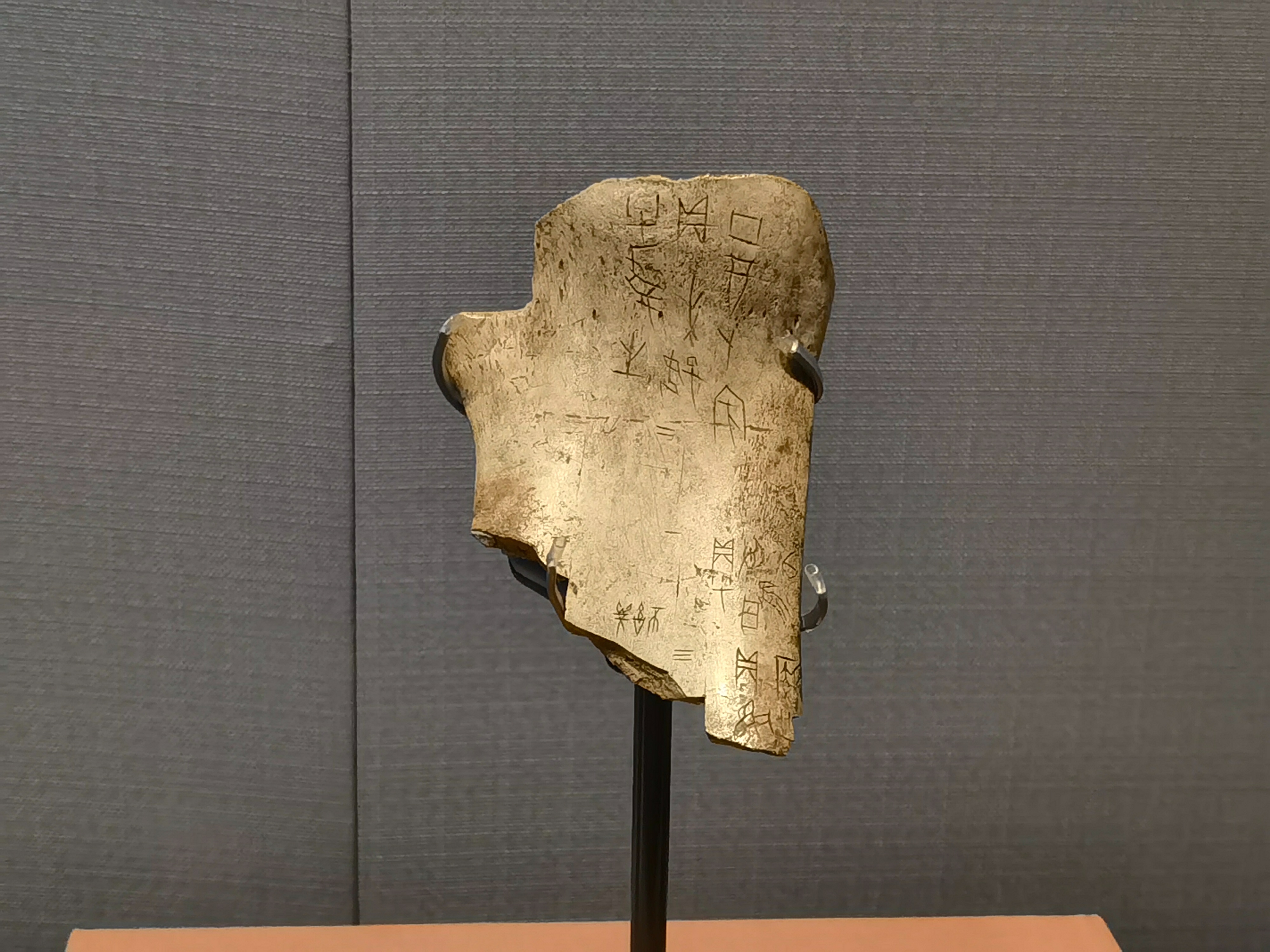 令人惊喜的是,这次特展还“晒出”了一枚商妇好贞卜甲骨。妇好是商王武丁的妻子,殷墟出土的上百条甲骨卜辞表明,妇好多次受命征战沙场,为商王朝拓展疆土立下汗马功劳。她还经常受命主持祭天、祭先祖、祭神泉等各类祭典,又任占卜之官,地位显赫。这枚甲骨正反两面均有卜辞,卜辞内容与妇好的生育之事有关。卜辞的大意问妇好是否怀孕,占卜结果是,妇好已经怀孕。