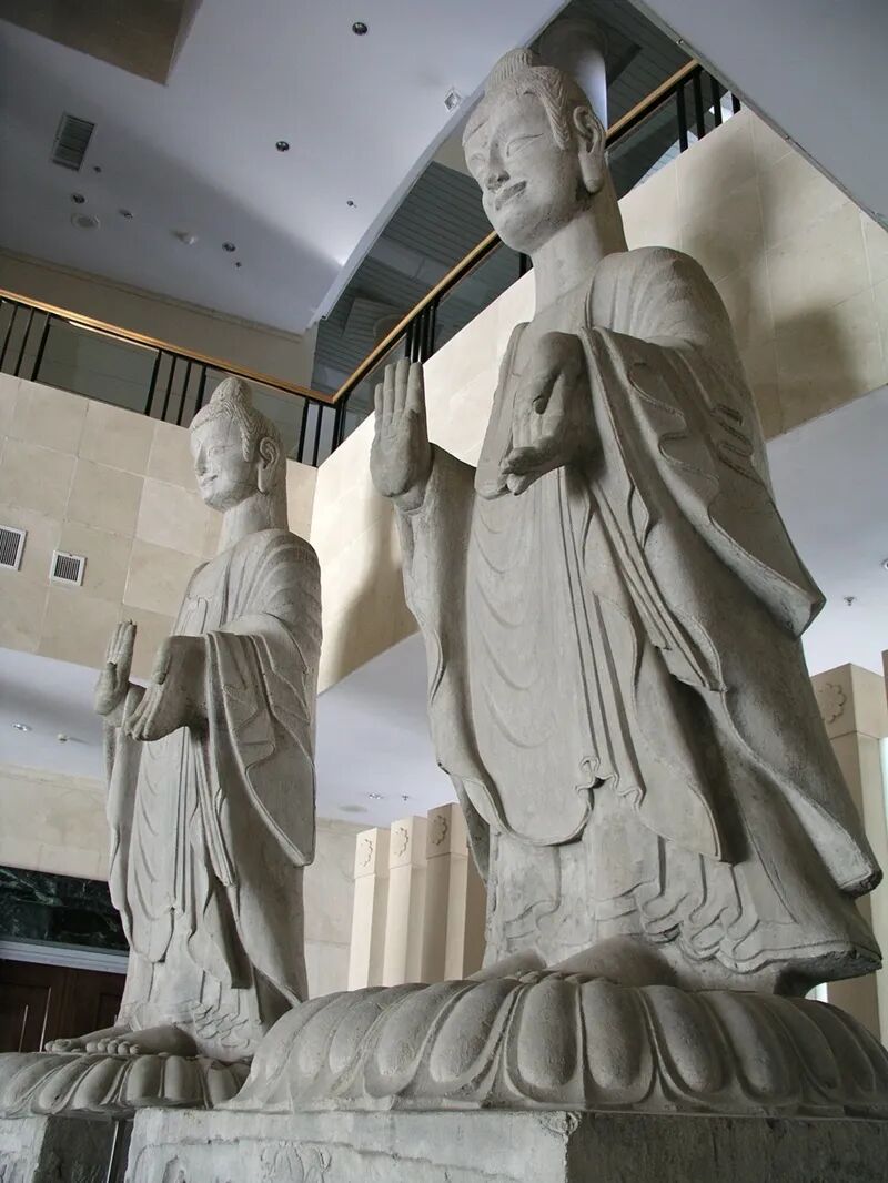 有些是辗转来到青岛。九大“镇馆之宝”中,观众最熟悉的当属北魏石佛造像。两尊造像是目前全国博物馆室内陈列、同殿两佛并立且体量最大的古代石造像。因其高约一丈八尺,俗称“双丈八佛”。
