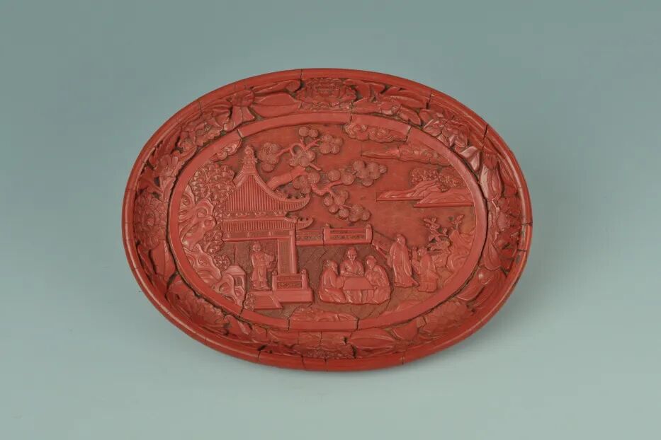 有些源于社会人士捐赠。明永乐剔红亭阁人物博弈图盘,漆色润红艳丽,盘中间雕刻着人物图案,极为细致。三位老者下棋,旁边有一位回首张望的执杖老者,身后跟随着携琴童子,小亭内还有一名捧茶童子。三种锦地表示不同空间:八瓣花卉纹表示大地,波纹表示湖水,云纹表示天空。花草树木与云朵湖水互相呼应,衬托出庭院屋舍的清幽。漆盘外壁雕着牡丹和芍药,花朵饱满,花叶繁茂。漆盘底部髹黑漆,刻有“大明宣德年制”楷书款,此款下面还隐藏着“大明永乐年制”的刻款,似为宫廷旧物。