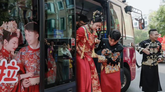 “咱没必要那么铺张浪费,去租那些豪华车队,”郭琪说,“最主要的是,我感觉这样可以跟陈世杰小时候的记忆有一种呼应,坐在公交车上,周围簇拥着亲朋好友,彼此之间更美好更温馨,我感觉非常浪漫和有意义。”