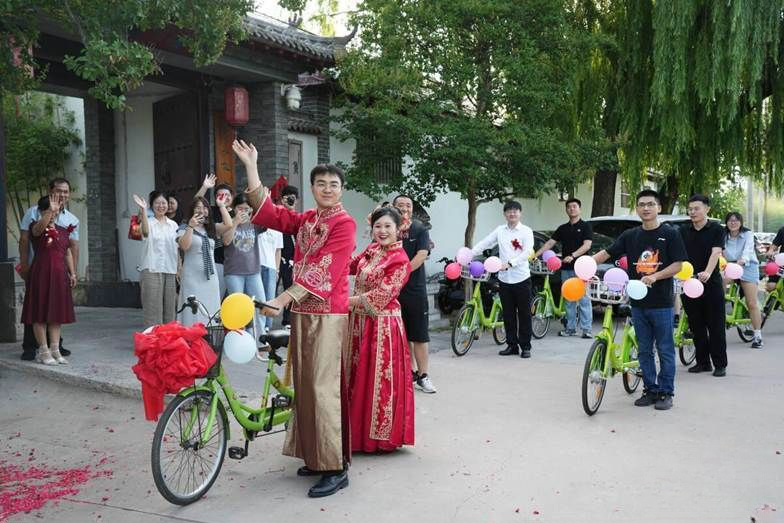 于是,更具复古气息的选择出现了。今年7月,潍坊青州市的新郎李长松与新娘郑明明身着喜服,带领着由11辆公共自行车组成的迎亲队伍,在亲友的祝福与路人的掌声中,携手踏上“幸福之路”。