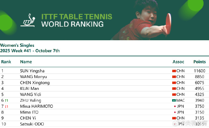 国际乒联公布2025年第41周排名。男单方面,王楚钦凭借在WTT中国大满贯中夺冠,世界排名积分从9425分跃升至10900分,成为男子乒坛历史上首位积分破万的运动员,刷新了国际乒联现行积分规则下的最高纪录。女单方面,“万分女王”孙颖莎继续领跑世界排名。