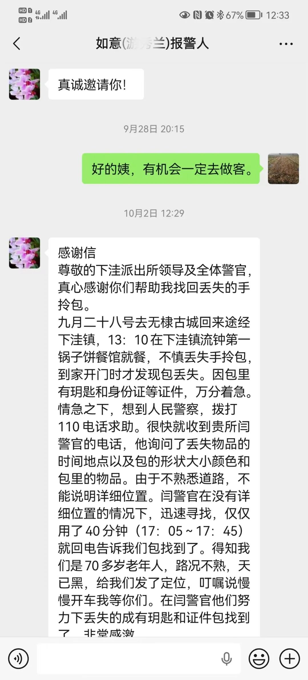 下洼派出所民警仅用40分钟帮群众找回失物。10月2日,群众发来感谢信。