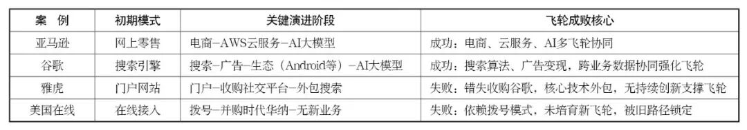 基于亚马逊与谷歌的实践,通过飞轮效应摆脱路径依赖可遵循以下路径。首先,精准锚定飞轮的战略基点,须深刻洞察技术变革趋势,在具有“报酬递增”潜力的关键领域集中投入,如亚马逊选择电商、谷歌聚焦搜索,确保飞轮从起点就具备形成马太效应的可能。其次,科学把握飞轮的阶段演进规律,启动期聚焦核心能力的单点突破,为飞轮储备基础动能;加速期通过规模效应放大优势,拓展协同节点完善生态;自治期则依托多飞轮协同形成结构性优势,进入自主运转状态。再次,高效激活飞轮的初始动能是关键,启动阶段需通过“小切口”验证逻辑,如亚马逊初期聚焦图书品类、谷歌优化搜索算法,以低成本积累初始用户与数据,度过最具风险的“黑暗期”。同时,系统构建多飞轮协同生态是突破路径依赖的核心,需设计“新飞轮—旧飞轮”的增强回路,实现跨业务价值传导,例如亚马逊零售飞轮为AWS提供支撑、AWS反哺零售升级,谷歌搜索飞轮赋能广告业务、广告收入推动AI研发,通过功能互补避免单一飞轮的路径锁定。最后,持续优化飞轮的迭代机制,以新飞轮为核心驱动,而非简单抛弃旧业务。新飞轮须基于新一轮技术创新构建产业生态,如亚马逊的云计算、谷歌的AI大模型,其技术能力可渗透至旧业务,激活传统业务、存量用户等旧路径资源,将其转化为新飞轮的战略基础,实现从旧路径到新路径的平稳跃迁。