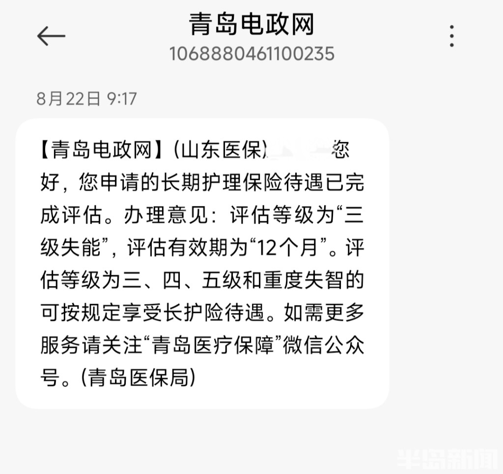 以父亲家为圆心,通过青岛医保小程序里的“医保服务地图”寻找周边4公里范围内的定点长期护理机构,达成。准备材料提交申请,达成。配合工作人员的“突袭式”登门现场审核,达成。两周之后,杜霖收到了一条“青岛电政网”发来的短信通知:“您申请的长期护理保险待遇已完成评估。办理意见:评估等级为‘三级失能’,评估有效期为‘12个月’。评估等级为三、四、五级和重度失智的可按规定享受长护险待遇。”