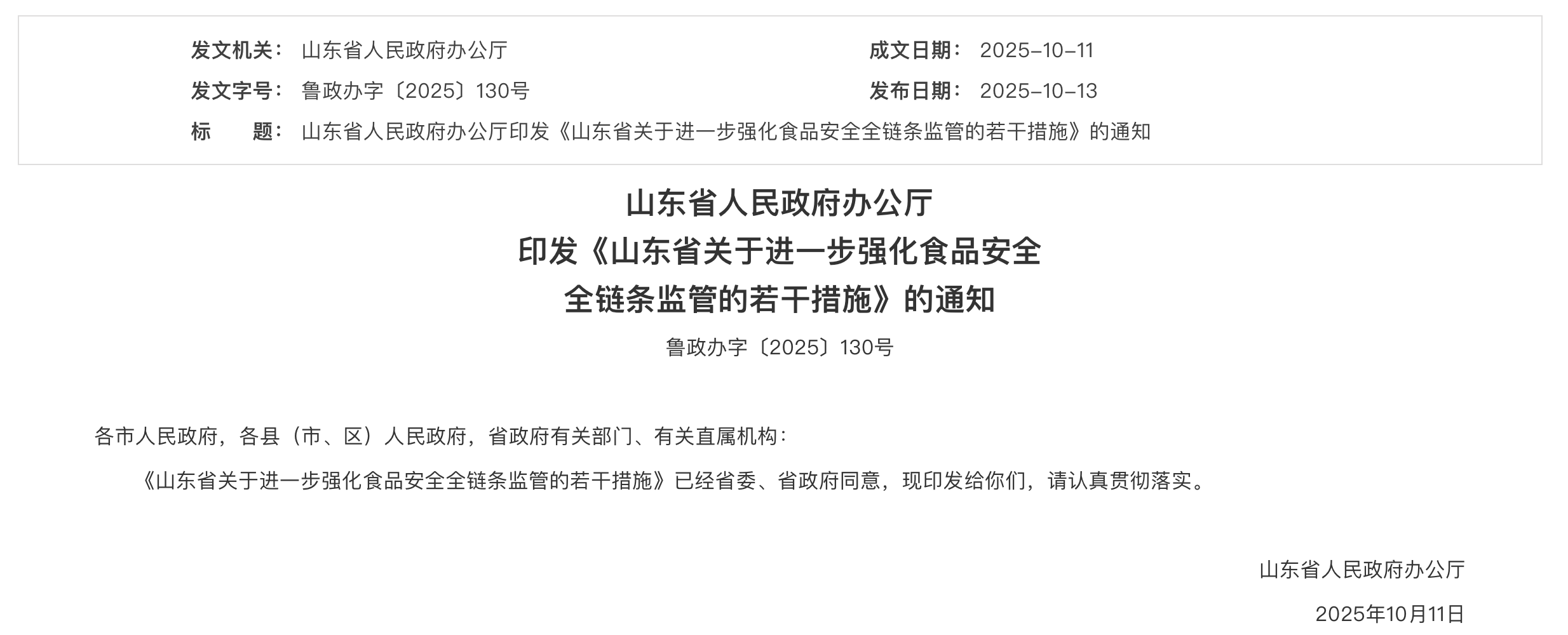 10月13日,山东省人民政府办公厅印发《山东省关于进一步强化食品安全全链条监管的若干措施》的通知,明确聚焦食用农产品、网络食品、餐饮服务、进口食品,以及食品生产经营,贮存、运输、寄递环节等7大方面,出台25项具体措施,进一步厘清食品安全监管责任,健全“从农田到餐桌”全链条监管机制,保障人民群众“舌尖上的安全”。