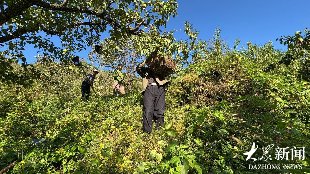 如今这些池梨成了虎林村的致富果,村里都是60岁以上的老人,但他们每天靠摘梨就可以收入100元。赵东锋说,现在很多人喜欢到虎林村预定,直接指定一棵树,把树上的梨都包下来。为了增加收入,提高池梨的品相,村民用自制的工具摘梨,不用爬树,站在树下就能把梨摘下来了。