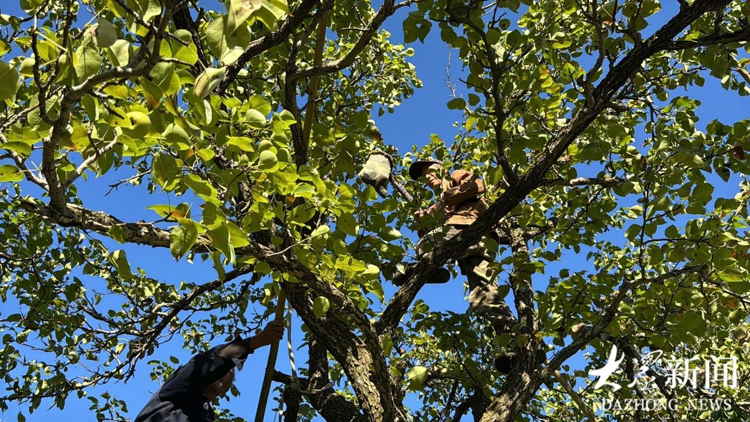 村民爬到树上采摘池梨。