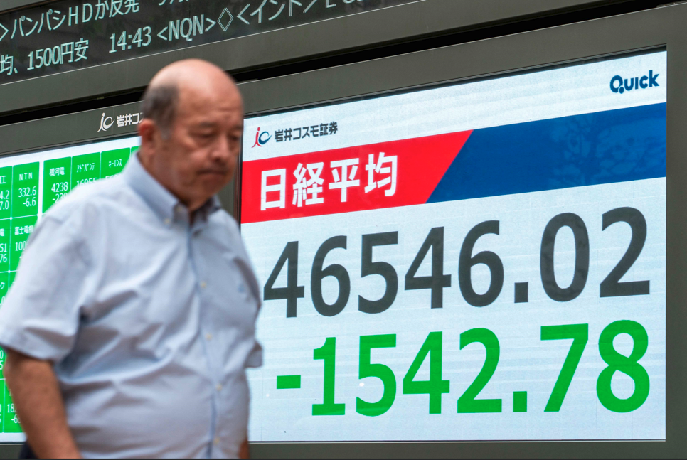 10月14日,行人经过日本东京街头的一处电子股指显示屏。 新华社