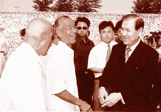2000年,卢泰愚在济南长清与卢庄村族人交谈。