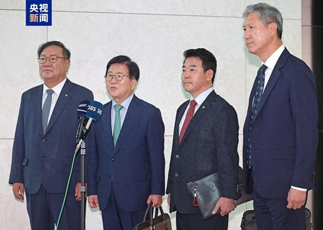 今年8月,卢载宪(右一)作为韩国总统特使团访华团成员从仁川国际机场启程时接受采访。