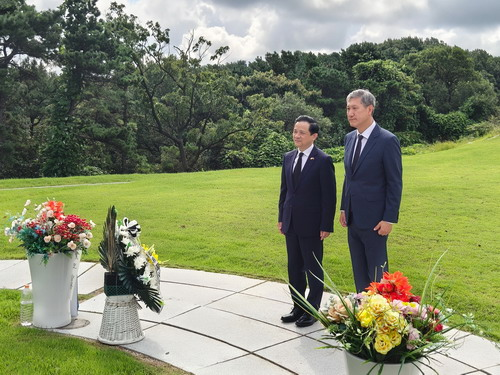 驻韩国大使戴兵在中韩建交33周年前夕祭扫韩国前总统卢泰愚墓地,卢载宪陪同。 外交部网站