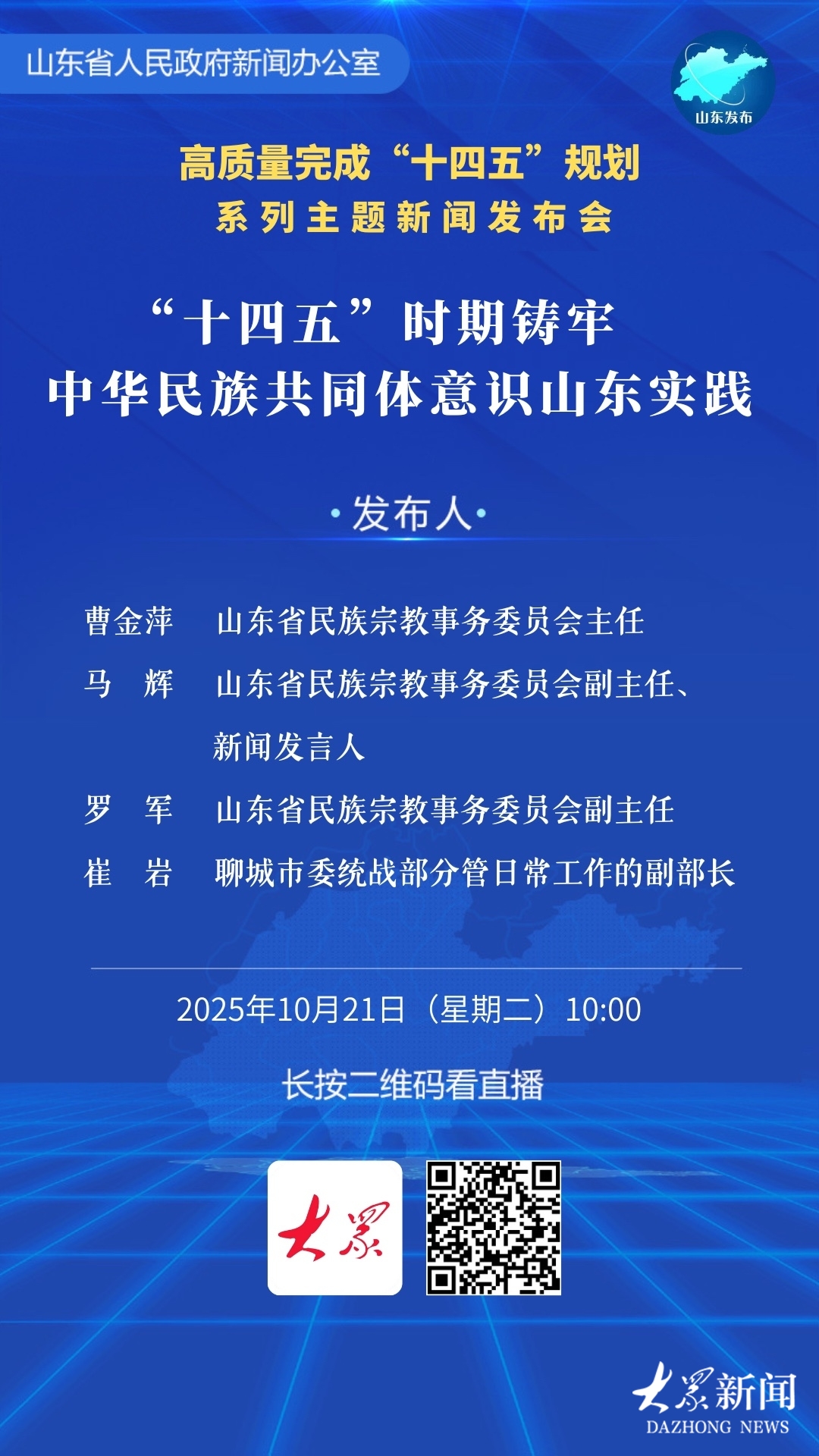 事关加强和改进民族工作!今天上午10时山东省政府将举行新闻发布会山东发布 | 2025-10-21 07:10:14 原创崔晗 申家鑫来源:大众新闻微信扫码扫码下载客户端山东省政府新闻办定于10月21日(周二)上午10:00举行省政府新闻办新闻发布会,邀请省民族宗教委主要负责同志等介绍“十四五”时期铸牢中华民族共同体意识山东实践。(大众新闻记者 崔晗 申佳鑫)责任编辑:张誉耀