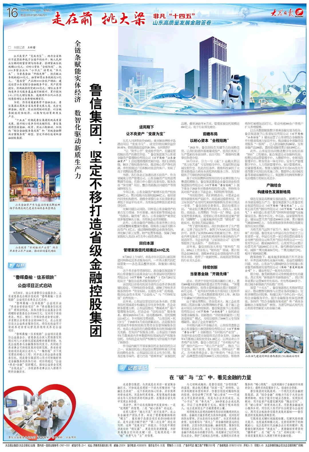 当前,作为省属重要骨干金融企业,鲁信集团正聚焦全省高质量发展大局,充分发挥金融、投资、实业协同联动优势,以全链条赋能实体经济,以数智化培育新质生产力。