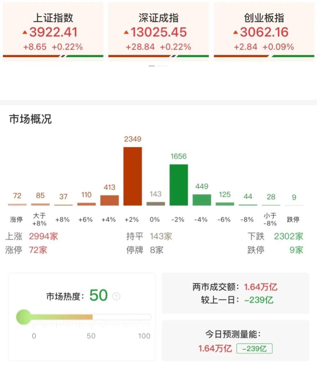 今日A股市场探底回升,三大指数全线收红。沪深两市成交额1.64万亿,较上一个交易日缩量239亿。