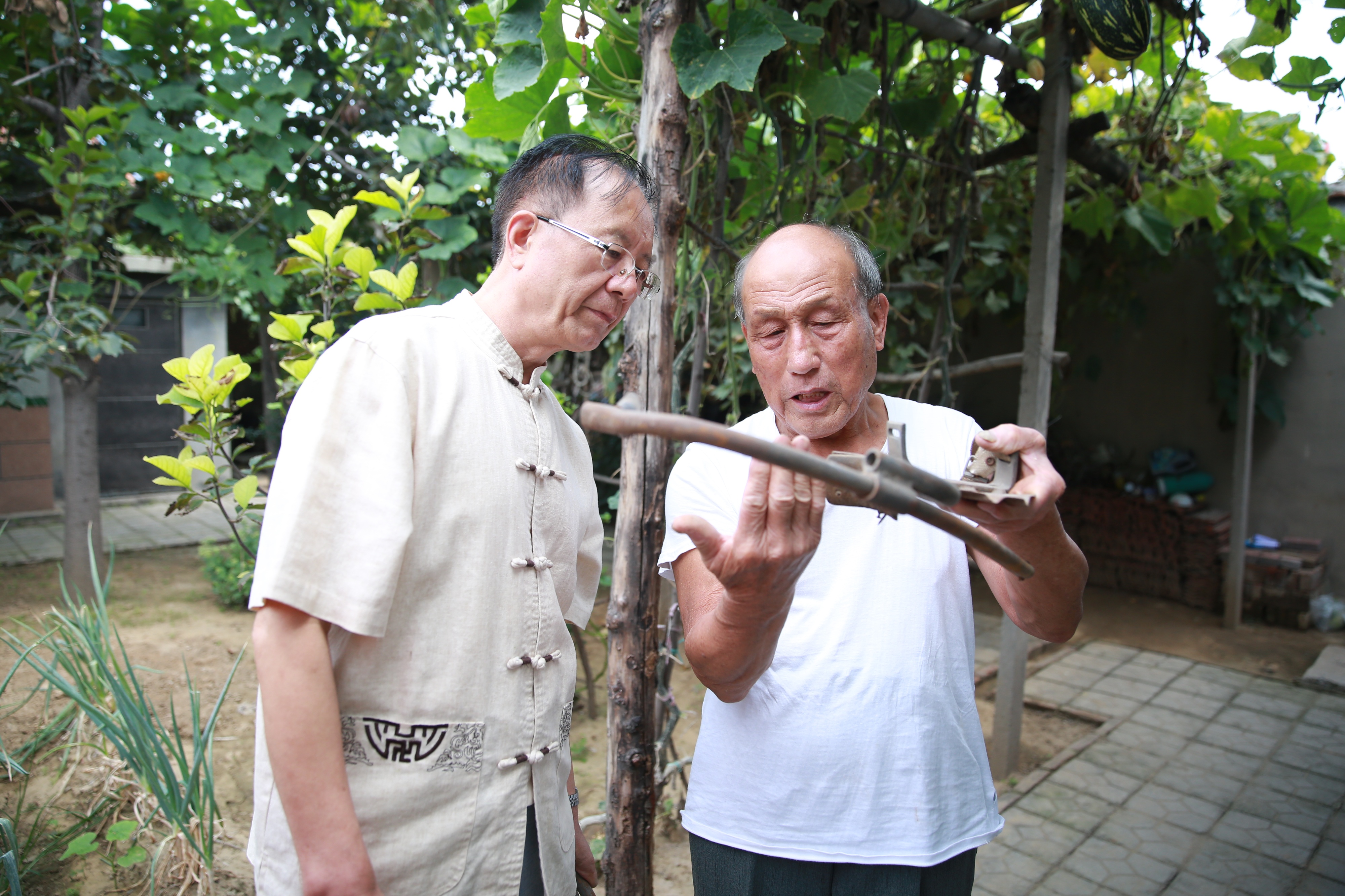 蒋新采访铁鞋发明人张克京(右)。