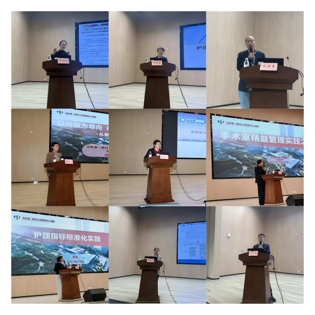 此次培训为济南市科协重点学术活动,研讨内容围绕“精益管理、质量提升、科研创新”三大主题展开,山东第一医科大学护理学院张爱华教授作题为《数智驱动护理前沿研究及进展》的主题演讲,系统阐述了人工智能、大数据等新兴技术在护理决策支持、风险预警与个性化干预中的应用前景。杜红霞以《以问题为导向,持续提升护理质量》为题,结合本院实践经验,展示了如何通过根因分析、PDCA循环等工具实现护理质量的闭环管理。医院门诊部副部长牟利宁从科普创作与审稿双重视角出发,深入讲解了《如何做好护理科普》。山东省护理专业医疗质量控制中心主任、山东省立医院护理部主任杨丽娟分享了《护理质量评价与持续改进实践》,介绍了科学指标体系构建与多维度质控方法的应用。医院精益办刘焕章详细解读《精益管理促进流程优化》,通过真实案例剖析了减少浪费、提高护理效能的有效路径。医院护理部副主任王朝阳带来《手术室精益管理实践》专题讲座,聚焦手术接台效率、物资管控与团队协作优化策略。驼人集团王和魁以《铁三角模型——破局护理创新转化》为题,探讨企业、临床与科研三方协同机制,助力护理成果转化落地。济南市护理专业医疗质量控制中心秘书、医院科护士长王晓虹以《精益铸就品质护理、管理构筑卓越标杆》为题对全市2025年度护理质控工作进行了反馈。医院护理部东院区负责人李伟分享了《护理指标标准化实践》,展示如何通过统一数据标准提升质量与管理效能。