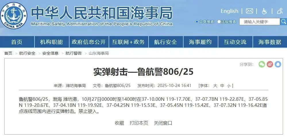 据中国海事局网站消息,潍坊海事局发布航行警告,10月27日0时至14时,渤海潍坊港部分海域进行实弹射击,禁止驶入。