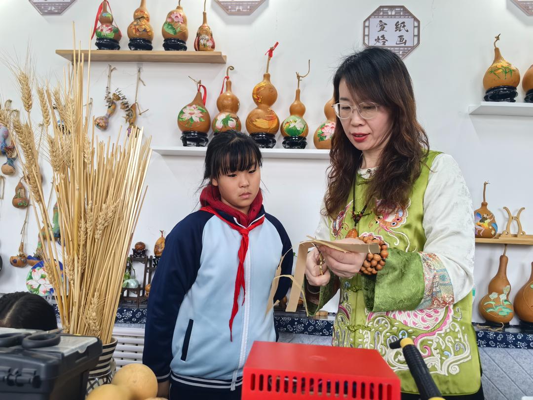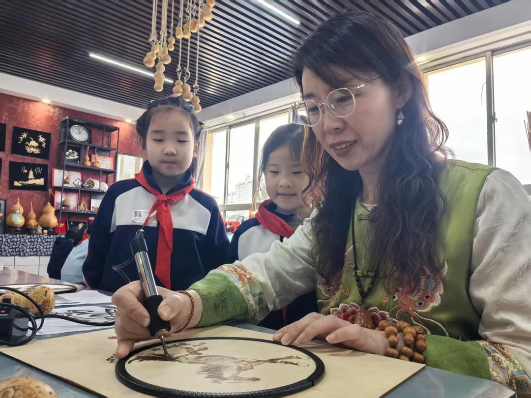 第四代传承人王燕,则为古老技艺注入了青春活力。作为张店区科苑小学的美术教师,她将烫画引入校园,打造了烫画传承基地。“第一次见袁老师的烫画,就被深深吸引了,这么美的手艺,应该让孩子们也了解。”王燕说,为了让学生容易掌握,她构建了“六步十二法”技法体系,还开发了麦秆烫画、葫芦烫画等简单易学的课程内容。“孩子们对烙铁又好奇又谨慎,看着他们从手抖到熟练,慢慢烫出自己的作品,特别有成就感。”
