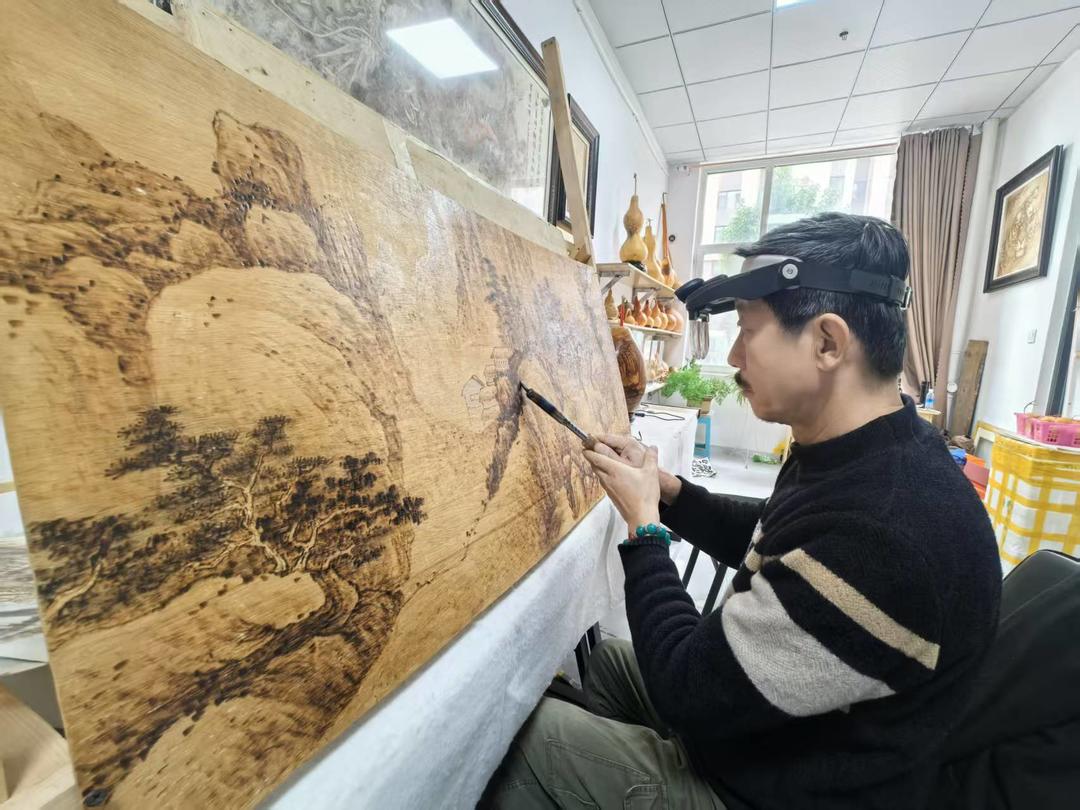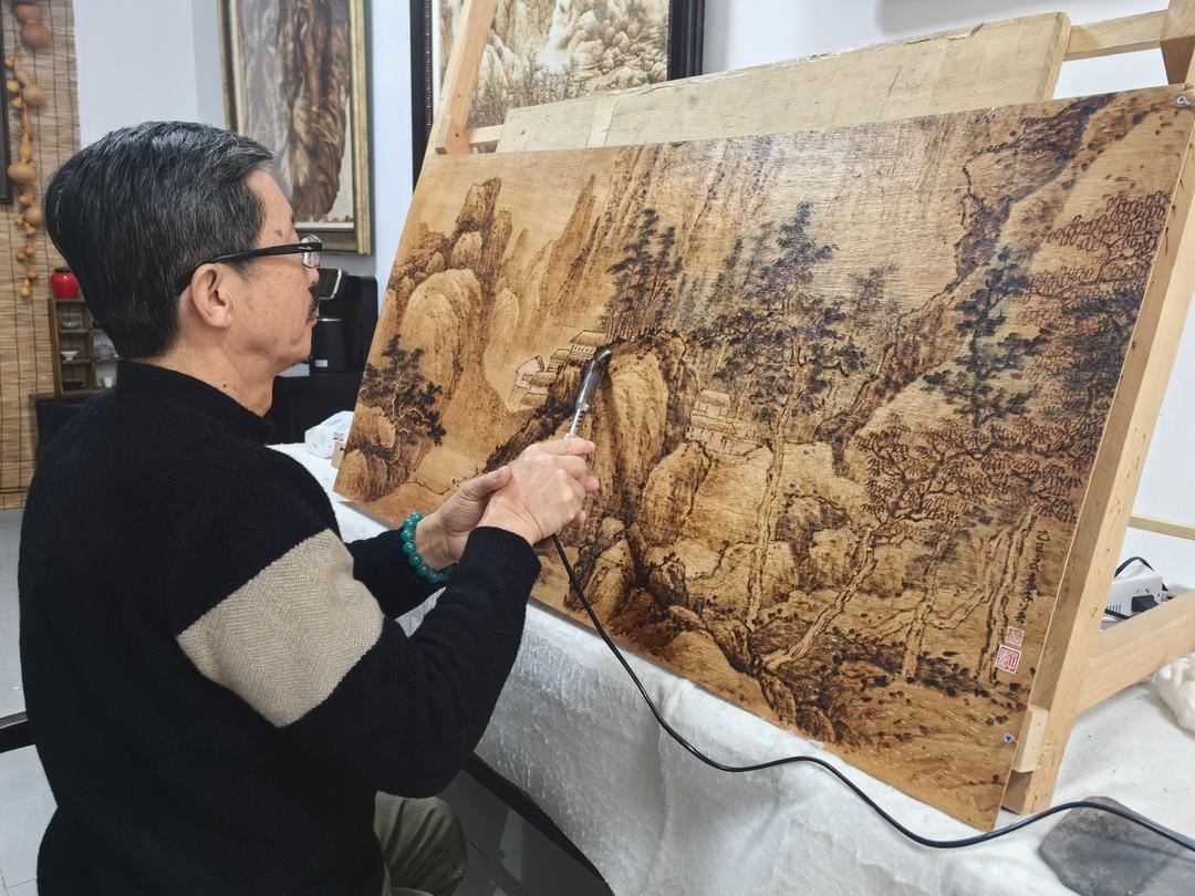 第二代传承人袁忠亮,在继承父辈技艺的基础上大胆探索,将木板引入创作载体。“父亲觉得竹筷空间太小,施展不开手脚,就试着在木板上创作。”袁俊平说,父亲通过反复试验,优化了烙铁加热方式,让烫画的表现力大幅提升,“从那以后,淄博烫画不再只是日用品的装饰,慢慢变成了能挂在墙上的艺术品。”袁忠亮的探索,让烫画题材从简单纹饰扩展到山水、花鸟等传统绘画领域,为技艺发展打开了新空间。
