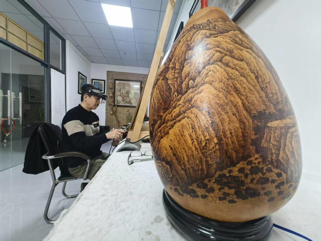 除了校园教学,王燕还与袁俊平携手开办公益社区课堂,利用抖音、微信等平台推广。“我们拍了很多技法教程,没想到吸引了不少网友关注,还有人特意从外地来学习。”王燕说,目前已培养烫画爱好者2000多人,她的作品《竹林晴雪》《高山流水》也在各类赛事中获奖。“传承不是守旧,得让烫画走进现代人的生活。”王燕开发的葫芦烫画灯、AI音箱等文创产品,深受年轻人喜爱,“现在年轻人愿意买、愿意传,这门手艺才能活起来。”