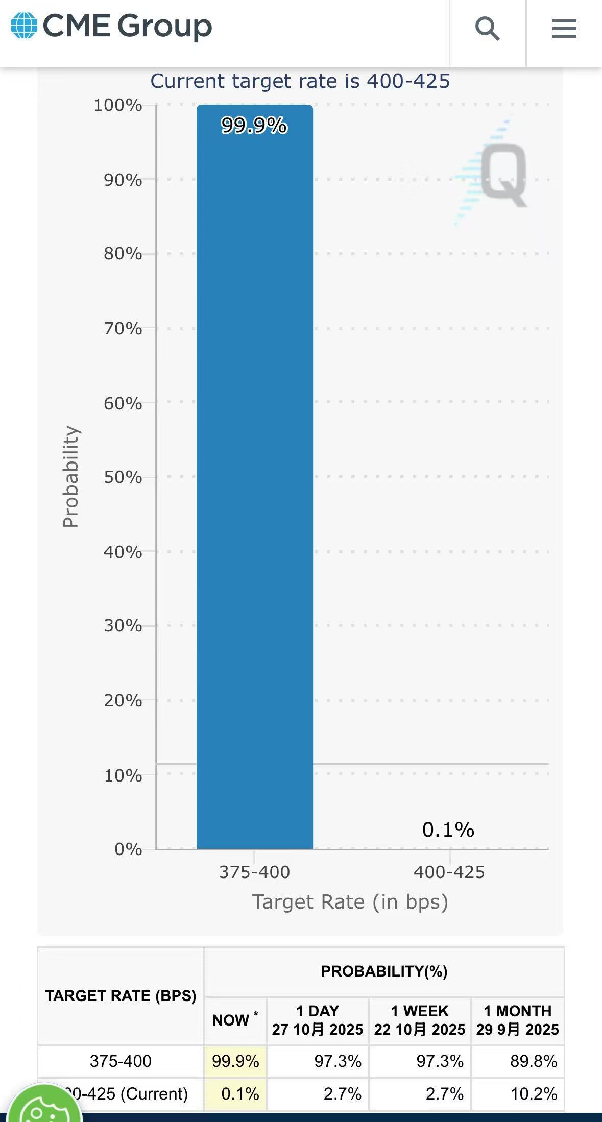此次降息符合市场预期。截至10月29日15时,芝商所FedWatch工具显示,美联储降息25基点的概率高达99.9%,维持不变的概率为0.1%。