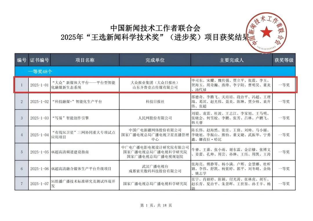 今天上午,在成都举行的“王选新闻科学技术奖”颁奖大会上,由大众报业集团、齐鲁壹点采用数智化技术自主研发建设的《“大众”新媒体大平台——平台型智能化融媒新生态系统》获一等奖。