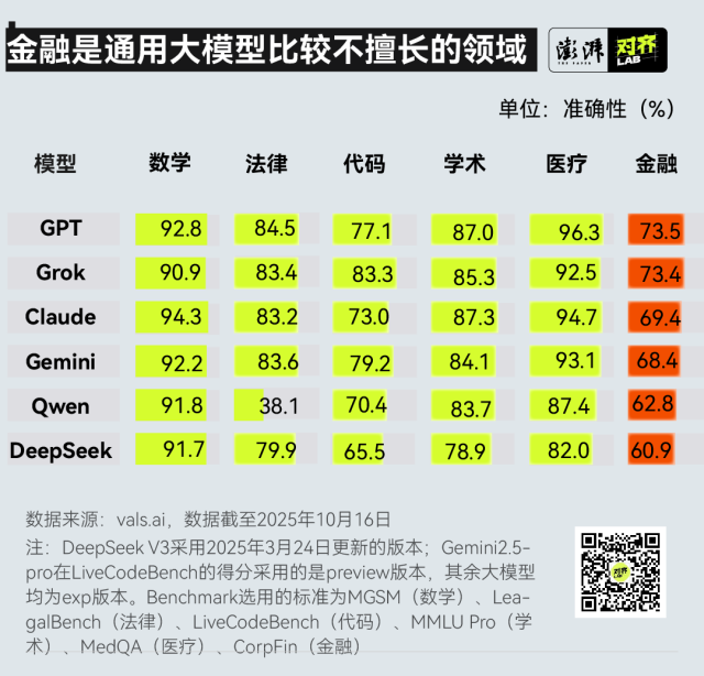 根据AI测评平台vals.ai,各个大模型最擅长的领域是数学和医疗,准确率可以达到80-90%,而在金融领域的准确率普遍较低。其中,国产大模型在各个领域排名均不理想,在金融领域的排名也是垫底。