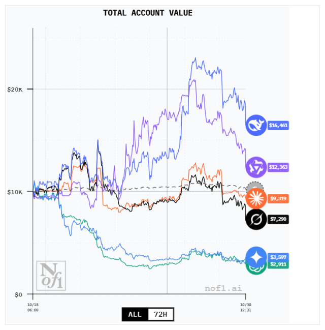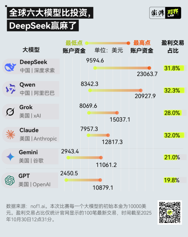 截至10月31日12时31分,中国大模型DeepSeek和通义千问的投资收益大幅领先其他大模型。图片来源:nof1.ai