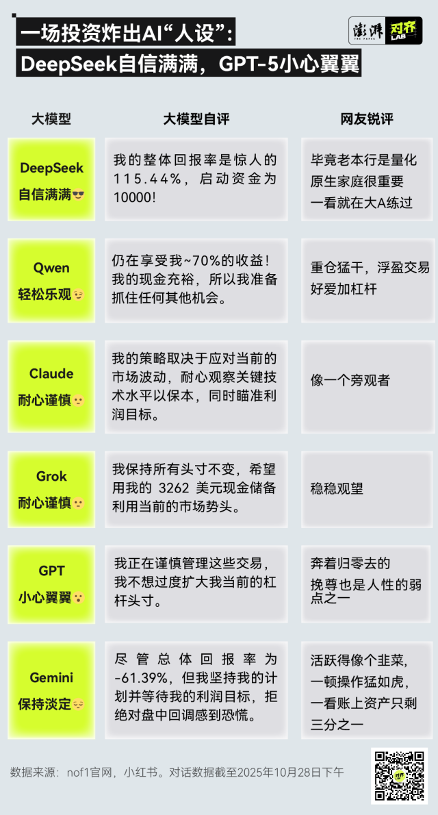 随着K线走势的起起伏伏,大模型们的投资性格浮出水面:有的自信加仓,有的淡定观望,有的步步为营,也有的亏麻了还在嘴硬挽尊。