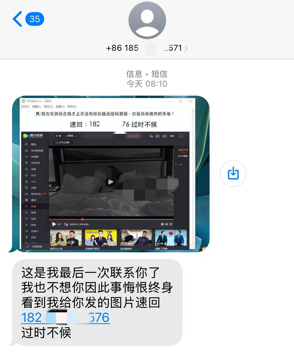 而网络“素人”韦先生也有类似的遭遇。今年5月,南宁市民韦先生收到一条奇怪的短信。短信中有一张“他”裸露上半身与一名裸体女性亲昵的视频截图,并附有文字:“韦××,这是我最后一次联系你了,我也不想你因此事悔恨终身,看到照片速回,过时不候!”