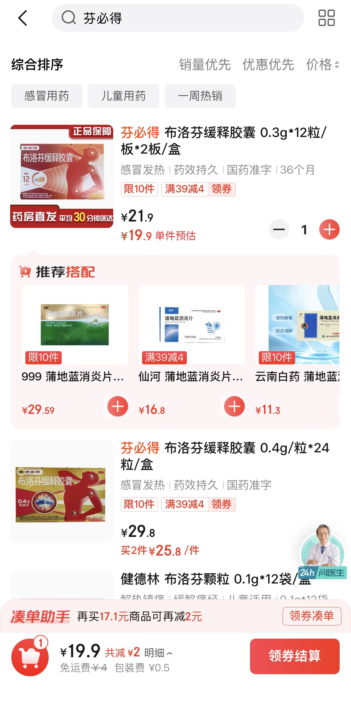 这种现象并非个例。记者走访济南多家药店发现,以0.3克*24粒装的布洛芬为例,线下药店售价在20元至29.8元之间;而在京东、美团、淘宝闪购的外卖售价有的在使用平台折扣后低至20元以下。