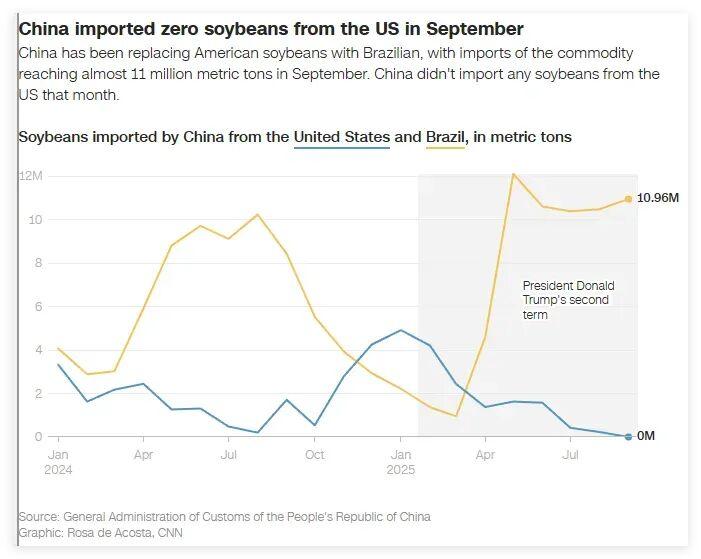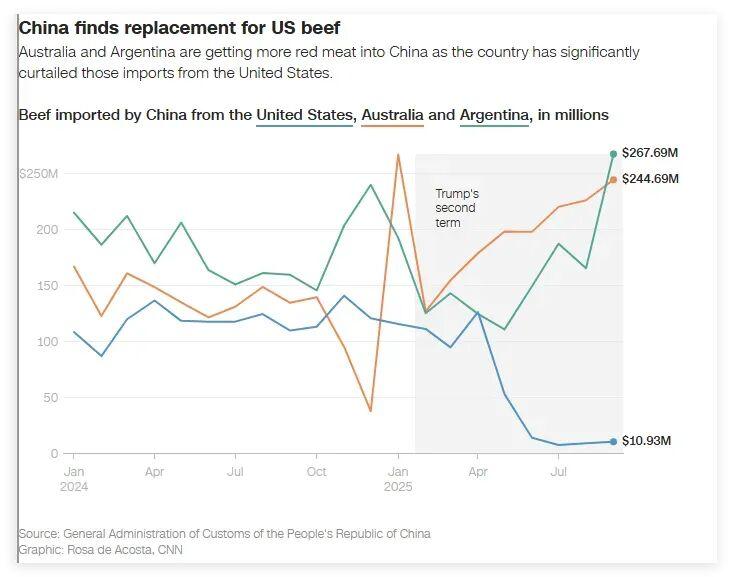 CNN呈现的第三张图表和第四张图表,则是中国进口美国大豆和牛肉的情况,统计范围是去年1月至今年9月。这两张图表的共性是,中国很快就找到了替代美国相关农产品的来源,比如巴西、澳大利亚以及阿根廷。
