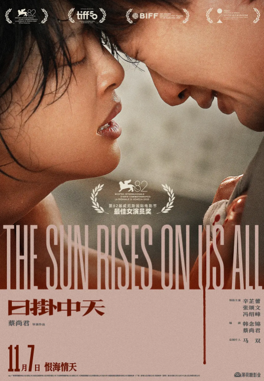 《日掛中天》由蔡尚君执导,辛芷蕾、张颂文、冯绍峰领衔主演,将于 11 月 7 日全国公映。该片片名源自粤剧《紫钗记》中的“日掛中天格外红”,讲述了一对昔日恋人分别多年后在南方小城重逢,却被命运裹挟的故事 。《日掛中天》入围第82届威尼斯国际电影节主竞赛单元 ,辛芷蕾凭借该片斩获最佳女演员奖。