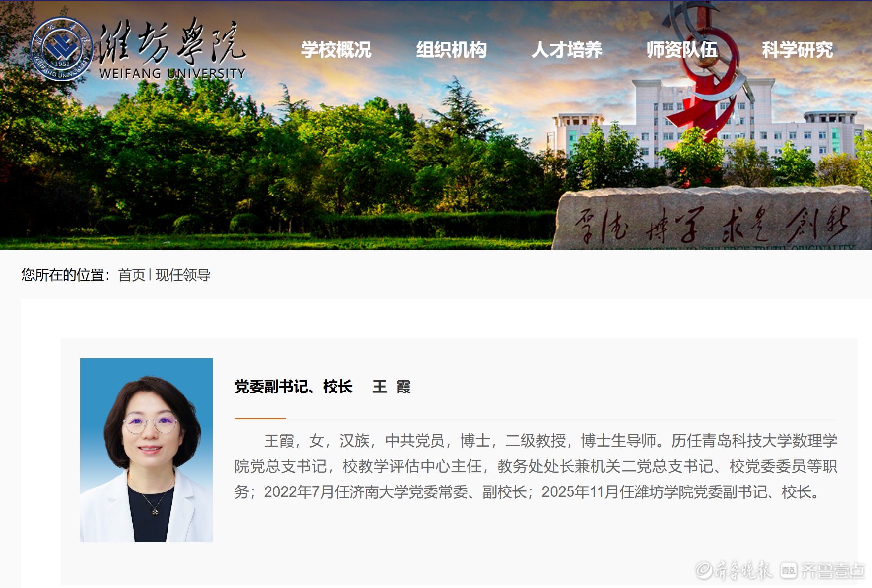 11月5日下午,潍坊学院官网“现任领导”一栏更新,王霞到任潍坊学院党委副书记、校长。