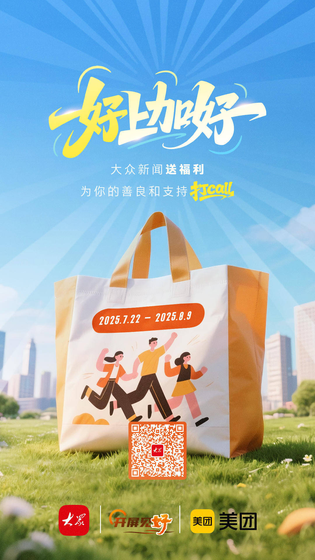 一张福利券,致敬平凡微光。今年7月,大众新闻联合美团开启“好上加好!为好人送福利”活动,每日通过大众新闻客户端活动入口抢券,百万份“生活福利券包”致敬《开屏见“好”》栏目关注的身边好人及广大读者。活动持续19天,吸引全网7.6万余人参与。