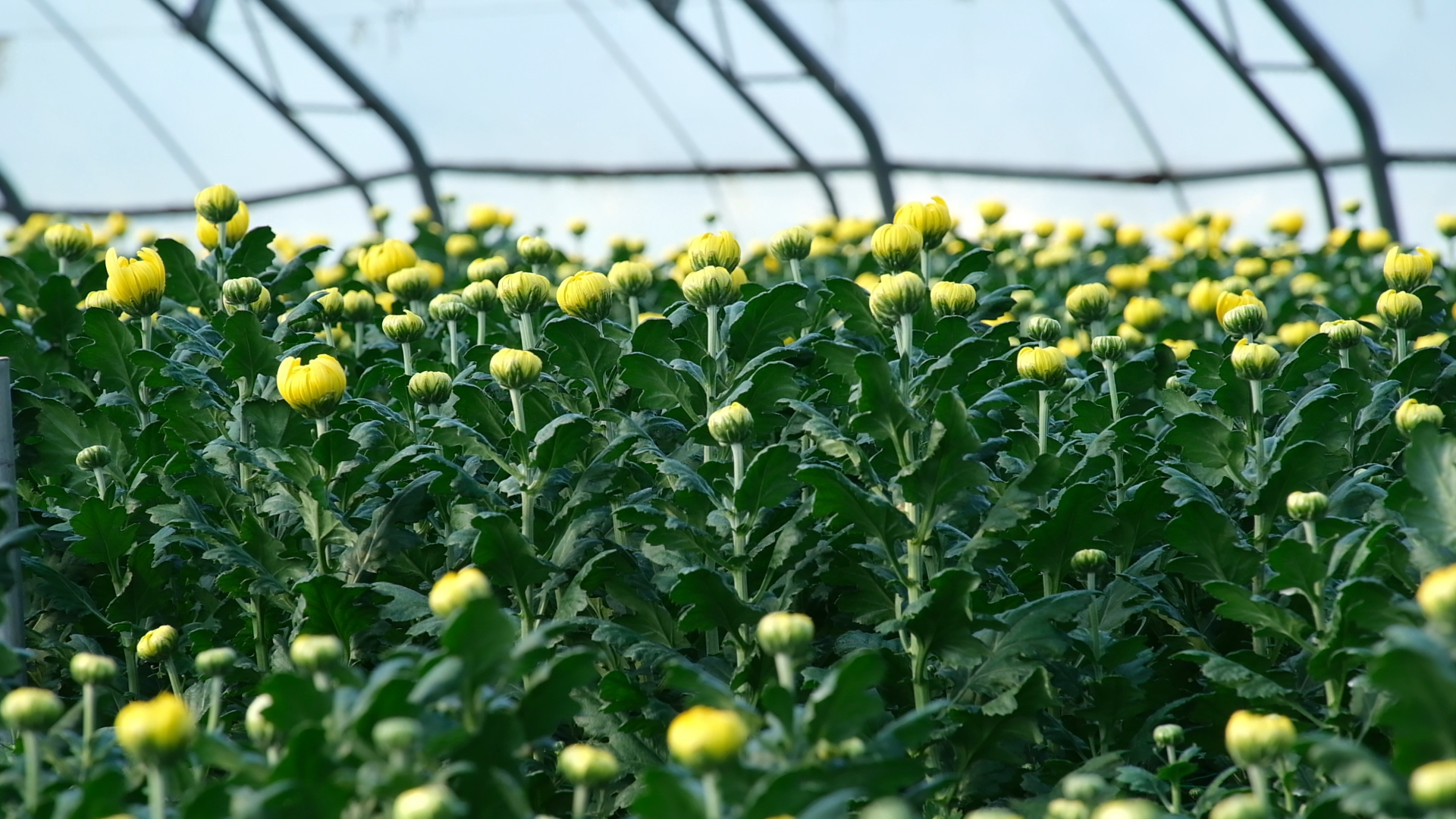 “现在种的花主要是两个品种,白色和黄色,白色的品种是京诚,黄色的是光玉。目前这两个棚有7亩地,接近30万株。”天骥生态农场负责人闻东坡说。