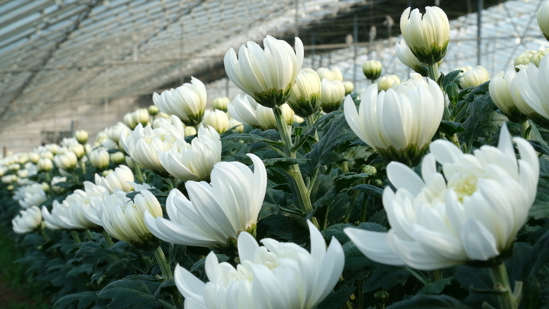 在农场技术员和工作人员的共同努力下,这片大棚里的菊花已突破传统种植的季节限制,从育苗催芽到花芽分化,每一环节都凝结着大家的心血和汗水。随着菊花产量与品质的双双跃升,他们也将目光投向了更广阔的国际市场,蓄势待发。