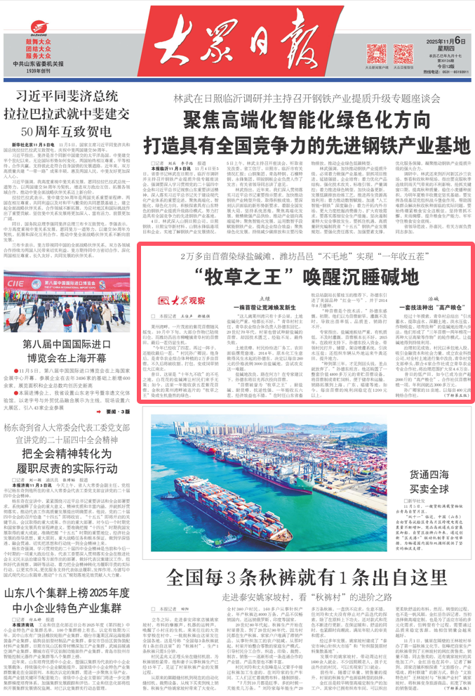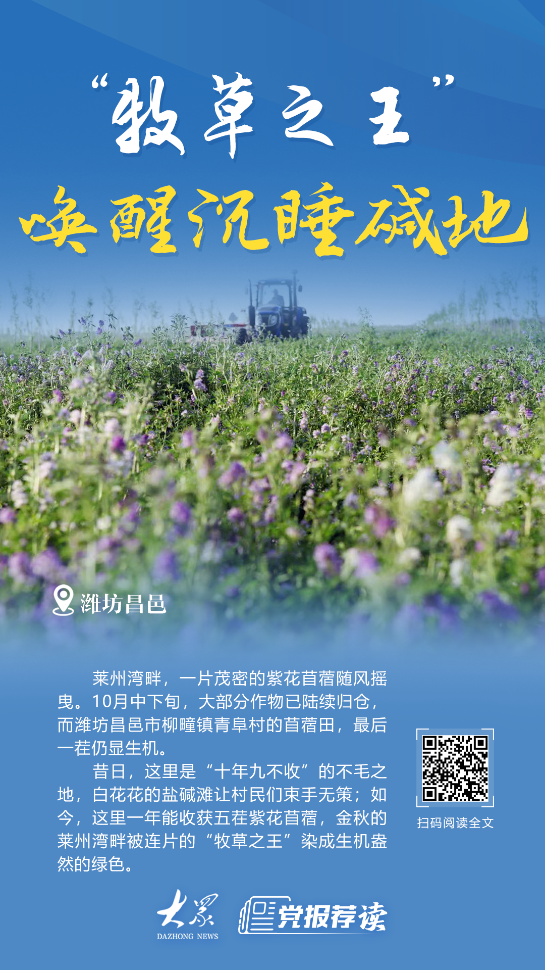昔日,这里是“十年九不收”的不毛之地,白花花的盐碱滩让村民们束手无策;如今,这里一年能收获五茬紫花苜蓿,金秋的莱州湾畔被连片的“牧草之王”染成生机盎然的绿色。