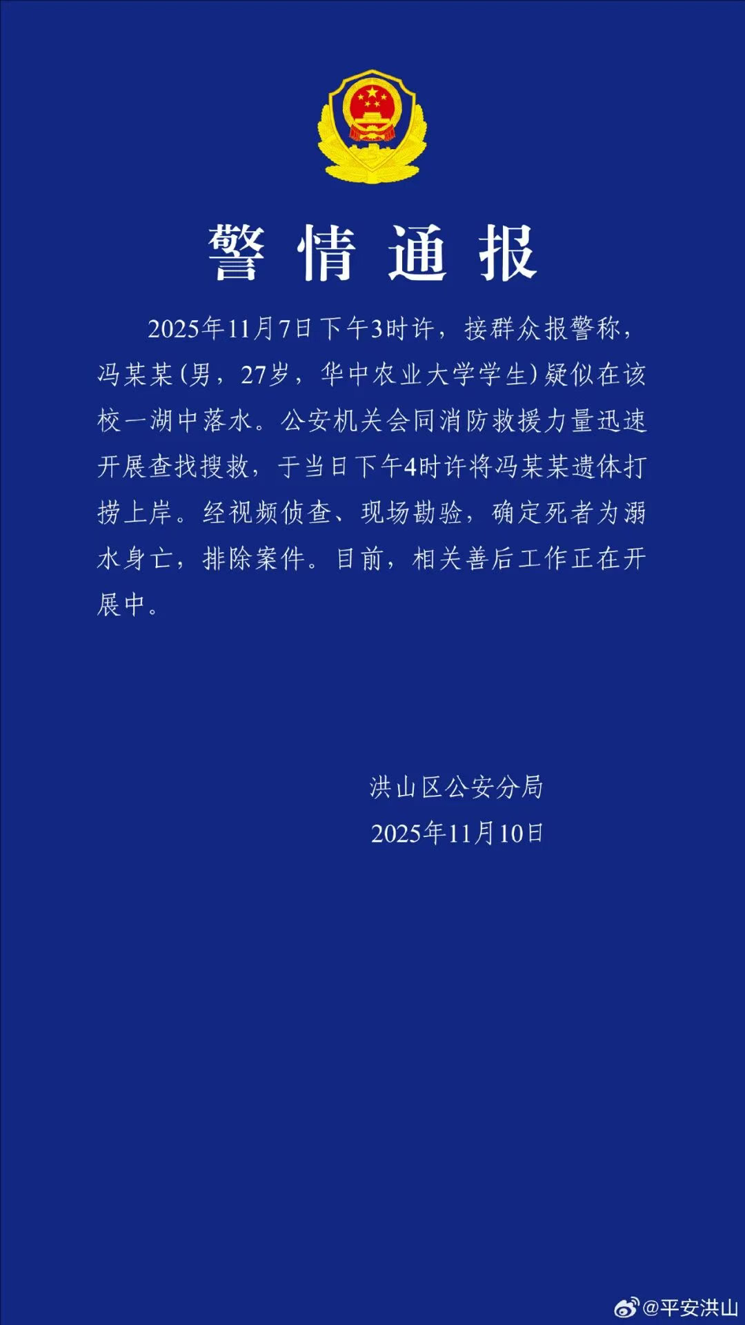 武汉市洪山区公安分局11月10日通报,11月7日下午3时许,接群众报警称,冯某某(男,27岁,华中农业大学学生)疑似在该校一湖中落水。公安机关会同消防救援力量迅速开展查找搜救,于当日下午4时许将冯某某遗体打捞上岸。经视频侦查、现场勘验,确定死者为溺水身亡,排除案件。目前,相关善后工作正在开展中。(@平安洪山)