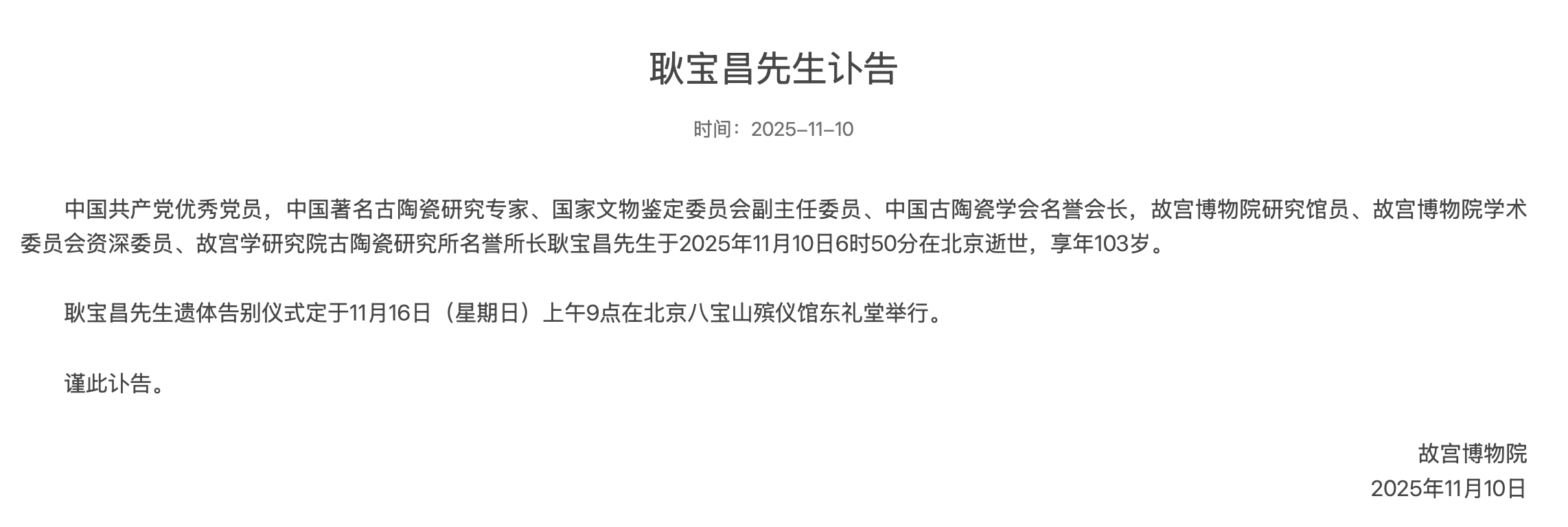 故宫博物院讣告称,中国共产党优秀党员,中国著名古陶瓷研究专家、国家文物鉴定委员会副主任委员、中国古陶瓷学会名誉会长,故宫博物院研究馆员、故宫博物院学术委员会资深委员、故宫学研究院古陶瓷研究所名誉所长耿宝昌先生于2025年11月10日6时50分在北京逝世,享年103岁。