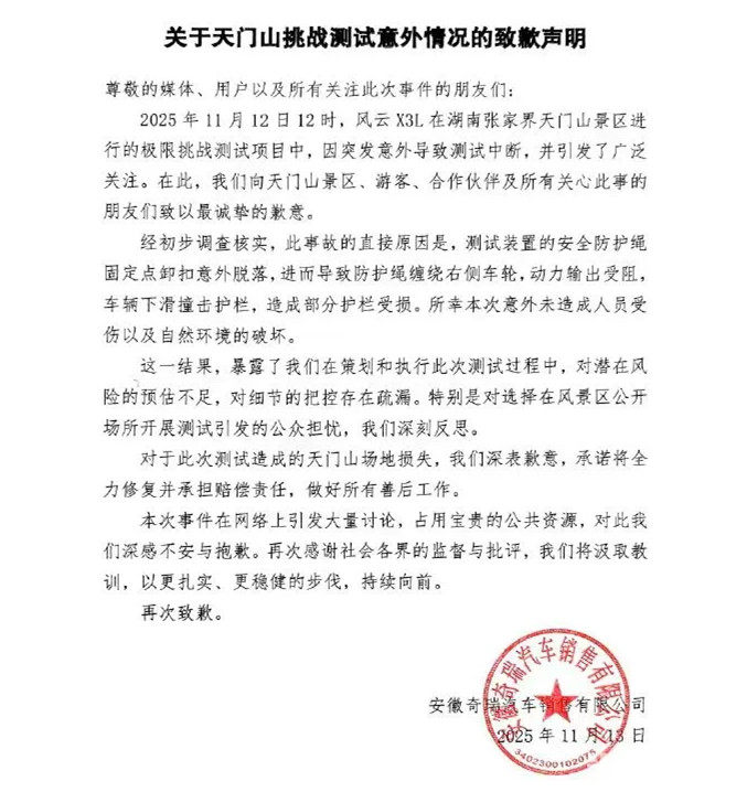 11月12日,网友发布的多段视频显示,一辆黄色SUV在湖南张家界天门山景区攀爬天梯时,突然从台阶上下滑并撞断部分护栏,场面相当尴尬。后据相关媒体报道,该车型为奇瑞风云X3L,今年9月17日才上市,售价10余万元,为“方盒子SUV”,采用了增程动力系统。11月13日,奇瑞汽车致歉声明发布,表示“对于此次测试造成的天门山场地损失,我们深表歉意,承诺将全力修复并承担赔偿责任,做好所有善后工作”。