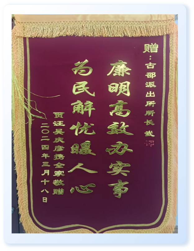 一年前,闫大姨夫妻俩承接某集团土方业务,在合同履行过程中和供货方发生矛盾,合同不能正常履行,前期预付的20余万元货款也要不回来。多次维权无果,夫妻二人陷入困境。转机出现在2024年3月,供货方为古邵派出所辖区企业,武畅梳理纠纷警情时注意到了此案。他主动上门去找闫大姨,却吃了近两小时“闭门羹”,终于见到闫大姨时,对方态度冷漠。“大姨,您受委屈了。”武畅开口第一句,闫大姨鼻子一红便落了泪,这才打开心扉。此后一个月,武畅六次前往闫大姨家中沟通解决方案,和涉事企业协商,最终涉事企业不仅退还了货款,还承诺优先合作。拿到钱的闫大姨感动不已,为武畅送去了锦旗:“廉明高效办实事,为民解忧暖人心”;涉事企业为此专门给枣庄市公安局峄城分局写了一封感谢信,感谢古邵派出所为企业发展护航。