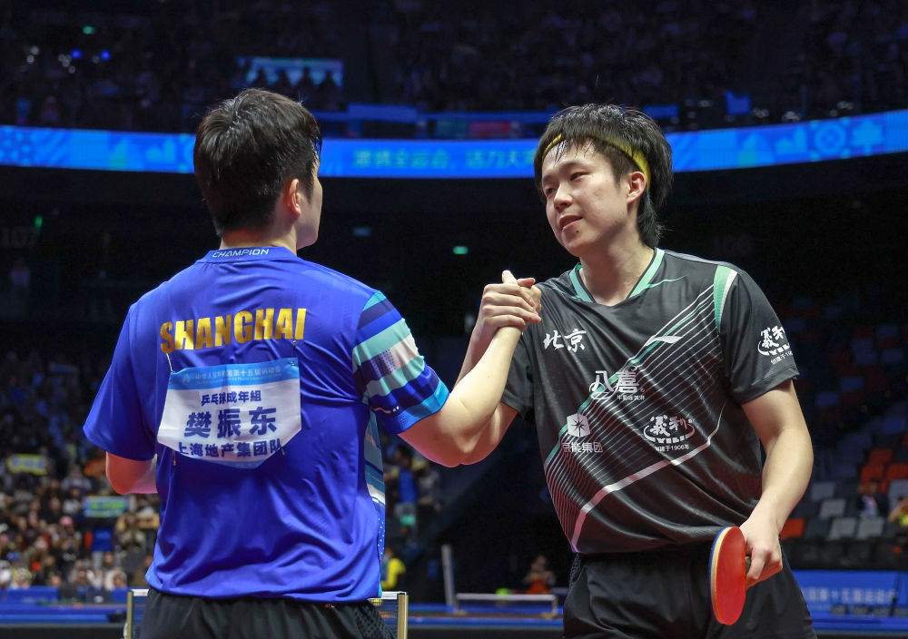 新华社澳门11月16日电(记者岳冉冉、李春宇、郭雨祺)11月16日,澳门银河综艺馆的聚光灯下,第十五届全运会乒乓球男单决赛场,上海队的樊振东与海南队的林诗栋相遇。