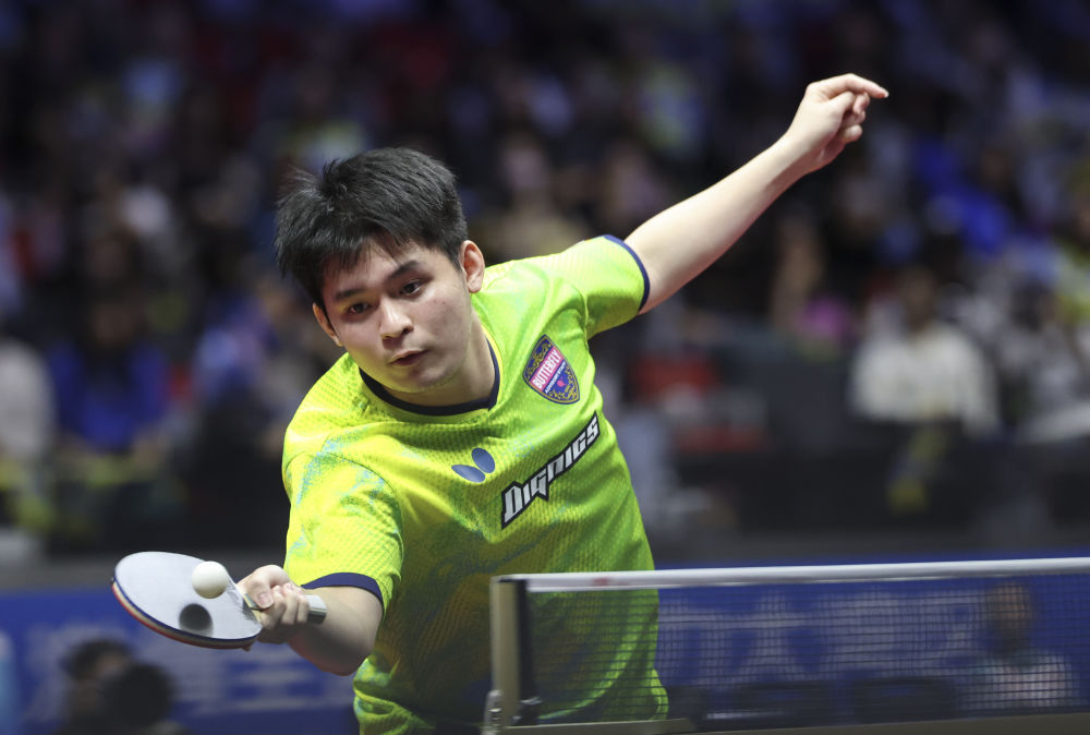 11月16日,海南队选手林诗栋在比赛中回球。新华社记者 刘续 摄