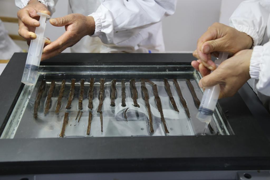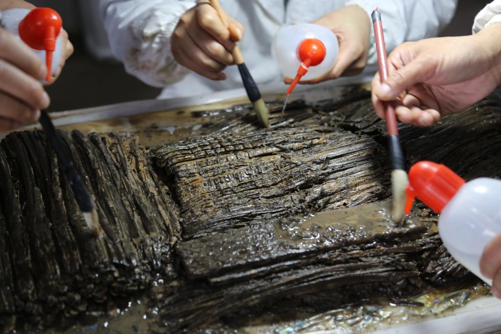 竹简出土时大部分是饱水状态,但有些竹简出土后接触空气会变形、干裂、卷曲。因此,修复人员采用润胀复形技术,使其变直,将干缩、卷曲竹简恢复至同批饱水竹简的状态。而最耗时的清洗环节中,即便操作熟练的技术人员,一人一天也仅能处理十几根竹简,这个过程必须用毛笔轻刷,稍用力就可能把竹简上的字迹洗掉。
