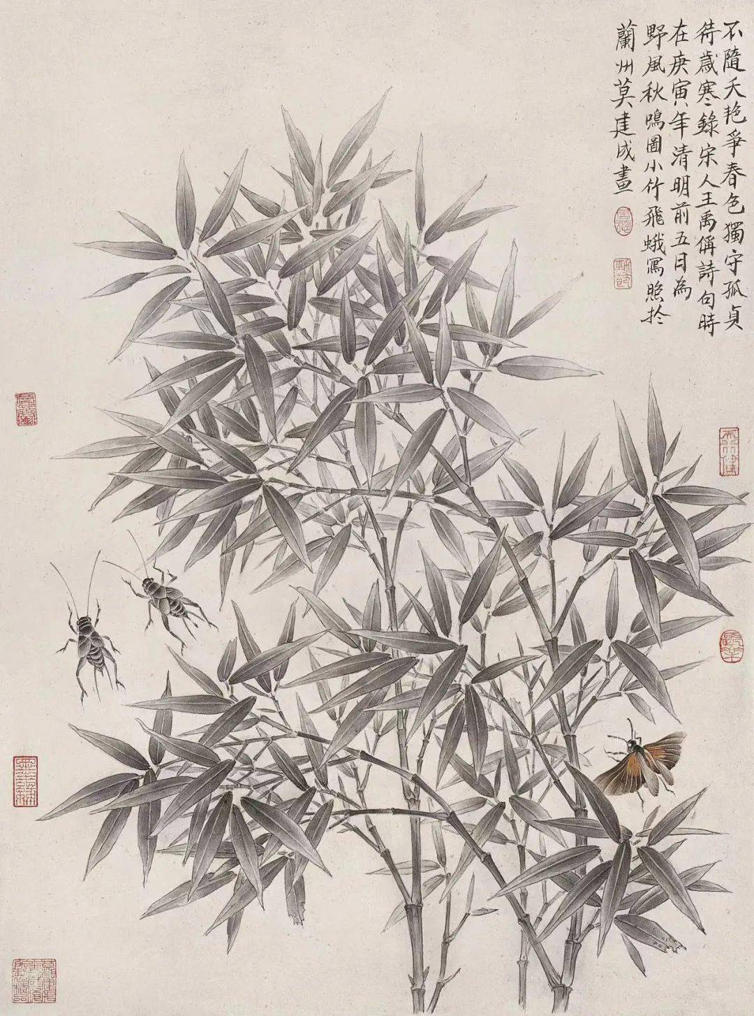 作为西北之子,莫建成更是成功地将那片土地特有的苍茫、寥廓和恢弘气息带进了工笔花鸟画领域。他的《野风秋鸣》组画,清静淡雅的画面间流淌着西北大地的秀异风骨。秋叶的脉络里藏着高原的风霜,小竹的挺拔中蕴含着大地的坚韧,野棉花的绽放诉说着生命的顽强,而那些粉蝶、草虫、朱顶雀,无不在这片土地上焕发着勃勃生机。他的笔触总是温柔地注视着那些平凡的生命——那些在家乡陇西、在西北高原随处可见的野草野花,甚至是路边不起眼的昆虫。众多小小的生命,经过他艺术的酝酿与升华,最终在宣纸上绽放出朴实而又厚重的光华。