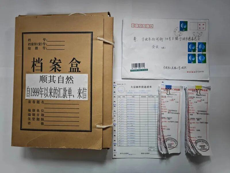 宁波市慈善总会保留着“顺其自然”1999年以来的汇款单及来信。宁波市慈善总会供图